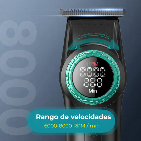 El barbero cuenta con una pantalla digital inteligente ultra grande. La pantalla inteligente muestra las diferentes velocidades, así como el tiempo de funcionamiento restante del barbero, facilitando la planificación de las recargas. Al presionar el botón de iluminación frontal, se enciende una luz directamente sobre la cuchilla, lo que permite un corte preciso incluso en condiciones de poca luz.