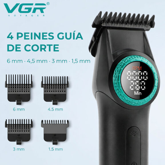 Los barberos profesionales VGR cuentan con cuchillas en acero al carbono de alta densidad para cortes limpios. El diseño en ángulo R en el borde de las cuchillas garantiza un uso seguro diario, y el corte a cero proporciona una línea limpia para recortar cabello, patillas, barbas y bigotes. 4 peines limitadores para el corte degradado de 0 a 6 mm.
