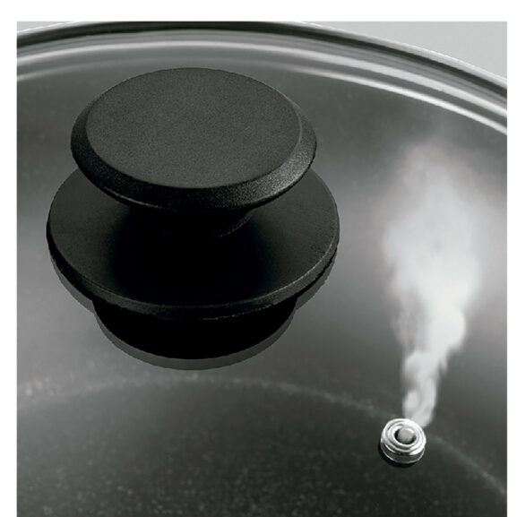 – Tapa de vidrio termorresistente con escape de vapor y cerquillo de acero inoxidable.