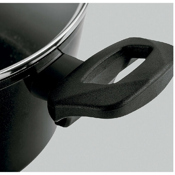 El interior está recubierto por un antiadherente bicapa con acabado en piedra y libre de PFOA, plomo y cadmio, que impide que los alimentos se peguen a la pieza y facilita la limpieza. La tapa de vidrio templado es resistente a altas temperaturas y permite ver la cocción de los alimentos sin destapar la olla. Su válvula de escape permite la salida del exceso de vapor. Válida para todos lo fuegos, incluidas las cocinas de inducción.