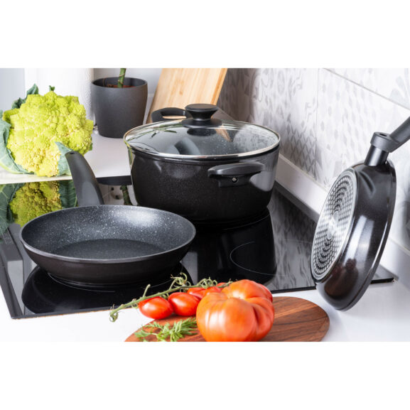 Composición: olla de 24 cm + tapa de cristal 24 cm + sartén de 24 cm + sartén de 20 cm.