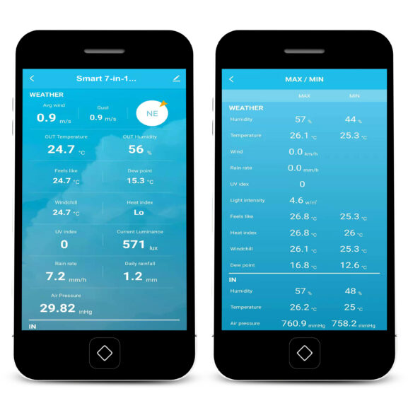Basándose en datos e historial en tiempo real, también se calculan la sensación térmica, el índice de calor y el punto de rocío, así como el pronóstico del tiempo para las próximas 24 horas. Esta estación meteorológica profesional está equipada con un pluviómetro para registrar la cantidad de precipitación. Si lo desea, puede configurar varias alarmas para valores máximos y mínimos de temperatura, humedad, velocidad del viento y precipitación, entre otros. La estación meteorológica tiene una memoria con los valores mínimos y máximos medidos.