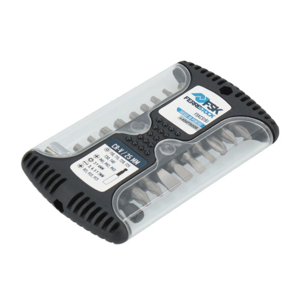 – 18 puntas cromo vanadio: PH-1, PH-2, PH-3, PL-3, PL-4, PL-5, PL-7, TX-10, TX-15, TX -20, TX-25, TX-30, TX-40, PZ-1, PZ-2, PZ-3