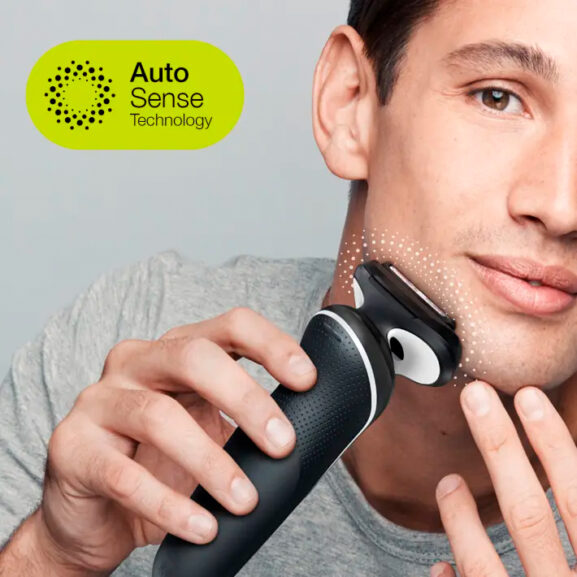 – Eficiente incluso en barbas duras: La tecnología AutoSense detecta y adapta la potencia a la densidad de la barba, capturando y cortando más pelo en cada afeitado.