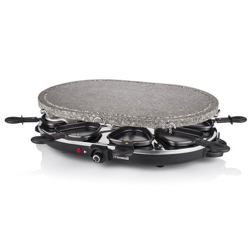 La raclette es una forma tradicional suiza de cocinar juntos que permite a las familias y amigos disfrutar de una tarde agradable cocinando en una mesa. No pase horas y horas en la cocina. Deje que cada uno prepare su plato favorito mientras están sentados a la mesa. La parrilla superior está hecha de piedra de alta calidad para que ase la comida sin aceite ni mantequilla. La parrilla incluye 8 sartenes para cocinar huevos, creps o queso fundido.