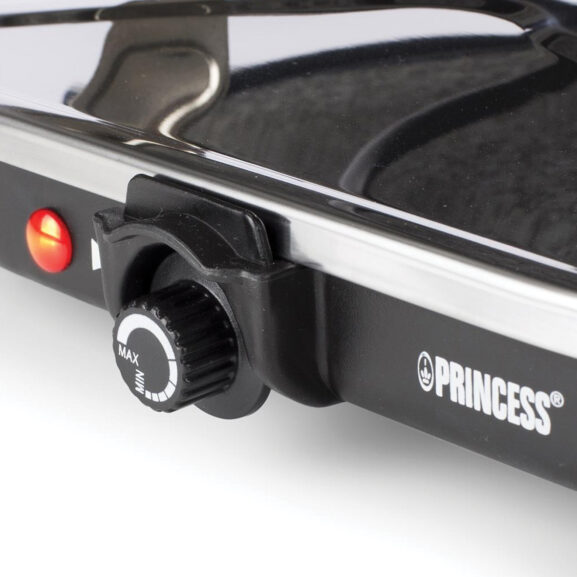 La parrilla Princess Oval Stone Grill & Raclette Party dispone de un termostato integrado para que ajuste la temperatura como desee. Con una potencia de 1200 W, alcanza la temperatura ideal rápido y mantiene el calor durante mucho tiempo. No es necesario precalentar la plancha de piedra en el horno.