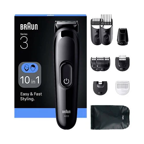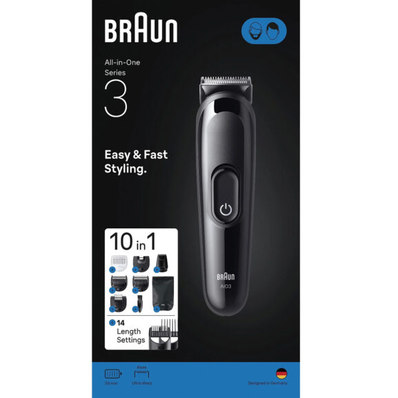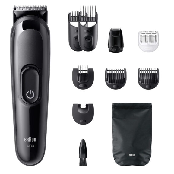 Recorta la barba y el pelo con la recortadora todo en uno AIO3560 Series 3 de Braun. Kit de afeitado 10 en 1 para barba, pelo, perfilado y mucho más.