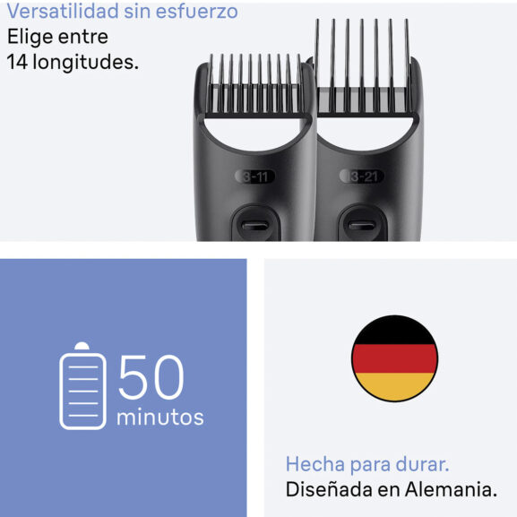 Mantente en completo control gracias a sus 14 ajustes de longitud: consigue resultados increíbles con los peines fijos de 1 y 2 mm y 2 peines deslizantes (3-21 mm).