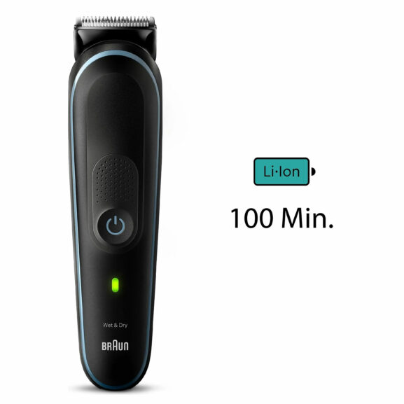 – Diseñada para durar: esta recortadora todo en uno para hombre incluye una potente batería de iones de litio que ofrece 100 minutos de autonomía inalámbrica, láminas ultraafiladas, y es 100 % resistente al agua.