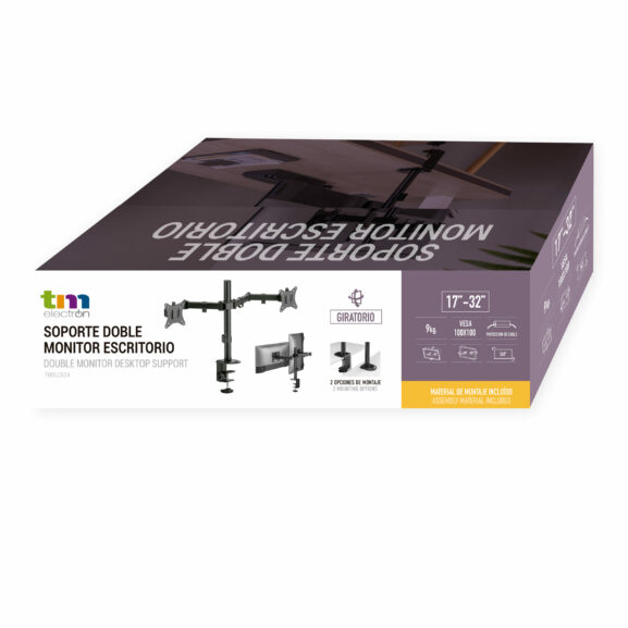 – Soporte estable fabricado en acero, para dos monitores de 17″ a 32″ de hasta 9 kg por pantalla.