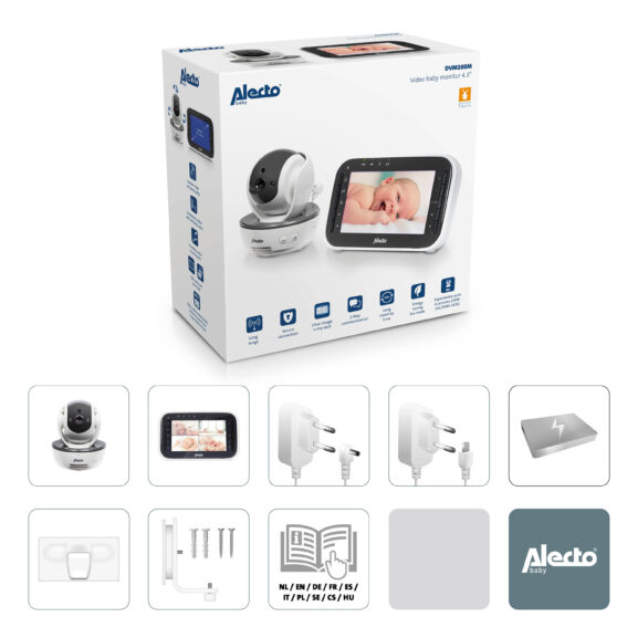 El Alecto Baby DVM200M es un monitor de vídeo para bebés que ofrece una excelente calidad de imagen y sonido. La serie de monitores para bebés DVM-200 ha estado entre los monitores para bebés más vendidos durante años. El DVM200 le permite escuchar y ver siempre a su hijo a través de la unidad para padres inalámbrica y recargable. La pantalla a color más grande de 10,9 cm/4,3 pulgadas le muestra al instante lo que sucede en la habitación del bebé utilizando la unidad para bebés y la cámara móvil a distancia con un sonido nítido e imagen clara, tanto de día como de noche. En total, se pueden conectar hasta cuatro cámaras a la unidad para padres ( DVM200C ). Además de las funciones esenciales, este monitor para bebés tiene muchos extras